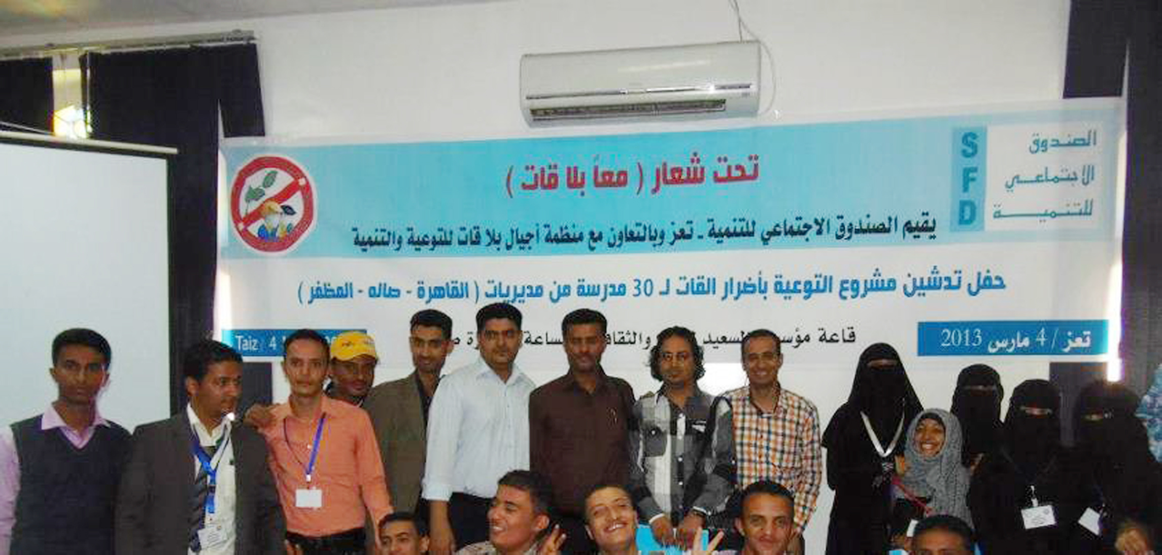 دشنت يوم الاثنين منظمة أجيال بلا قات للتوعية والتنمية وبدعم من الصندوق الاجتماعي للتنمية برنامج تدشين مشروع معا بلا قات بهدف توعية المجتمع بآفة انتشار القات عبر طلاب المدارس باعتبارهم جيل التغيير والقادريين على استيعاب ما هو ضار بالمجتمع اسريا واقتصاديا .