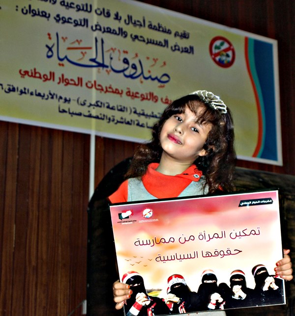 أقامت منظمة أجيال بلا قات للتوعية والتنمية بتعز عروض مسرحية بعنوان صندوق الحياة للتوعية بمخرجات مؤتمر الحوار الوطني الشامل .