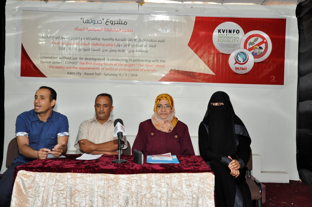 عقدت منظمة اجيال بلا قات للتوعية والتنمية بالمشاركة مع المركز الدنماركي أمس في محافظة عدن المنتدى الحواري الاول حول واقع ومتطلبات المشاركة السياسية للمرأة ضمن مشروع “صوتها لتعزيز المشاركة السياسية للمرأة”.